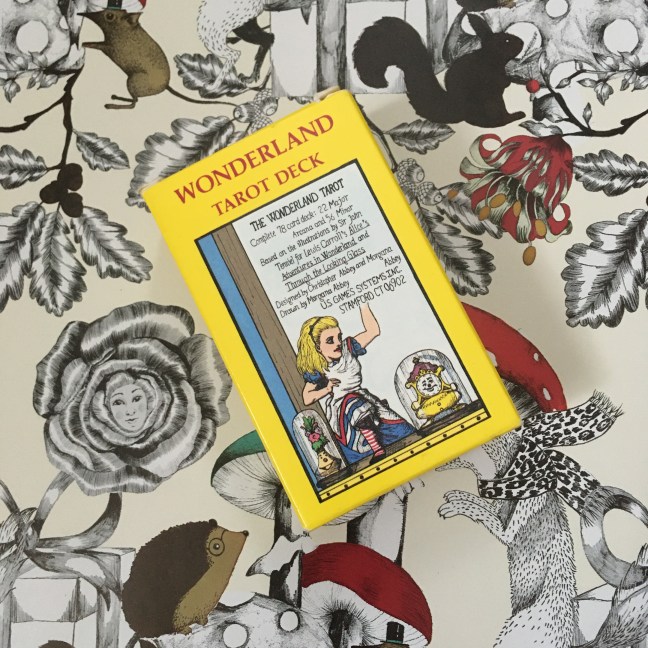 Today, I’m using a whimsical deck that I found in a New Age shop a while back and that, as a fan of Through the Looking-Glass in particular, I had to take home with me: The Wonderland Tarot by Morgana Abbey and Christopher John Abbey.