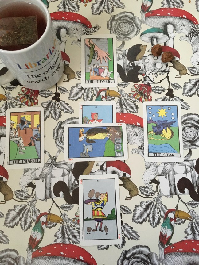 The first card I’ve drawn is the Two of Oysters. In this deck, that means the questioner is staring down the future and feeling a bit overwhelmed, especially in regards to a new project that is likely literary in nature. And with the upcoming deadlines for everything I still need to get done on NASCENT WITCH before release day, I can’t say that the card is wrong! (Don’t worry, I’m a Virgo through and through: it’ll get done. I’ll just be a nervous wreck until it does, that’s all!)