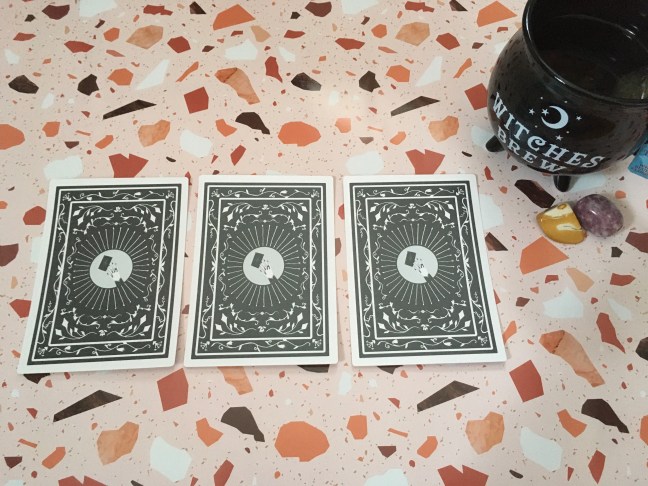 I like to use a simple three-card spread when I work with this deck. The positions of the cards don’t mean anything in particular; I’m more invested in what they say as a collective. I’ll typically do a drawing from this deck after I’ve finished my morning writing meditation, as part of my journaling practice.