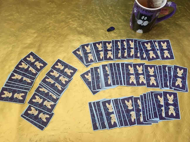 As you can see, I’ve set out a piece of lapis lazuli to channel clarity into today’s reading. I’ve also selected a rich tea that I typically reserve for dessert: English Tea Shop’s Chocolate Super Berry Burst. And because of the intensity of both the tea and the gemstone, not to mention the theme of the deck itself, I had to use my “catffeinated” mug! A friend’s mom sent this to me years ago and it has made me smile every time I’ve drunk from it.