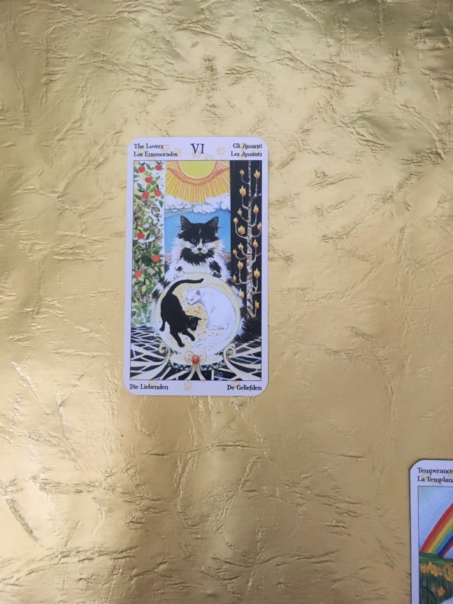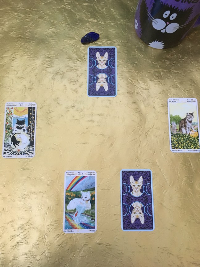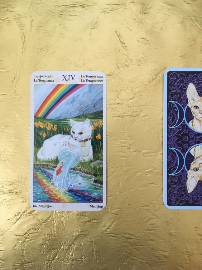 The third card I’ve drawn is The Lovers. In the Tarot of Pagan Cats, The Lovers is all about choosing and choosing well. The questioner knows she’s made the right call, and she can relax into that knowledge and reap the benefits of her good decision-making. With the card in this position, the spirit should feel at ease.